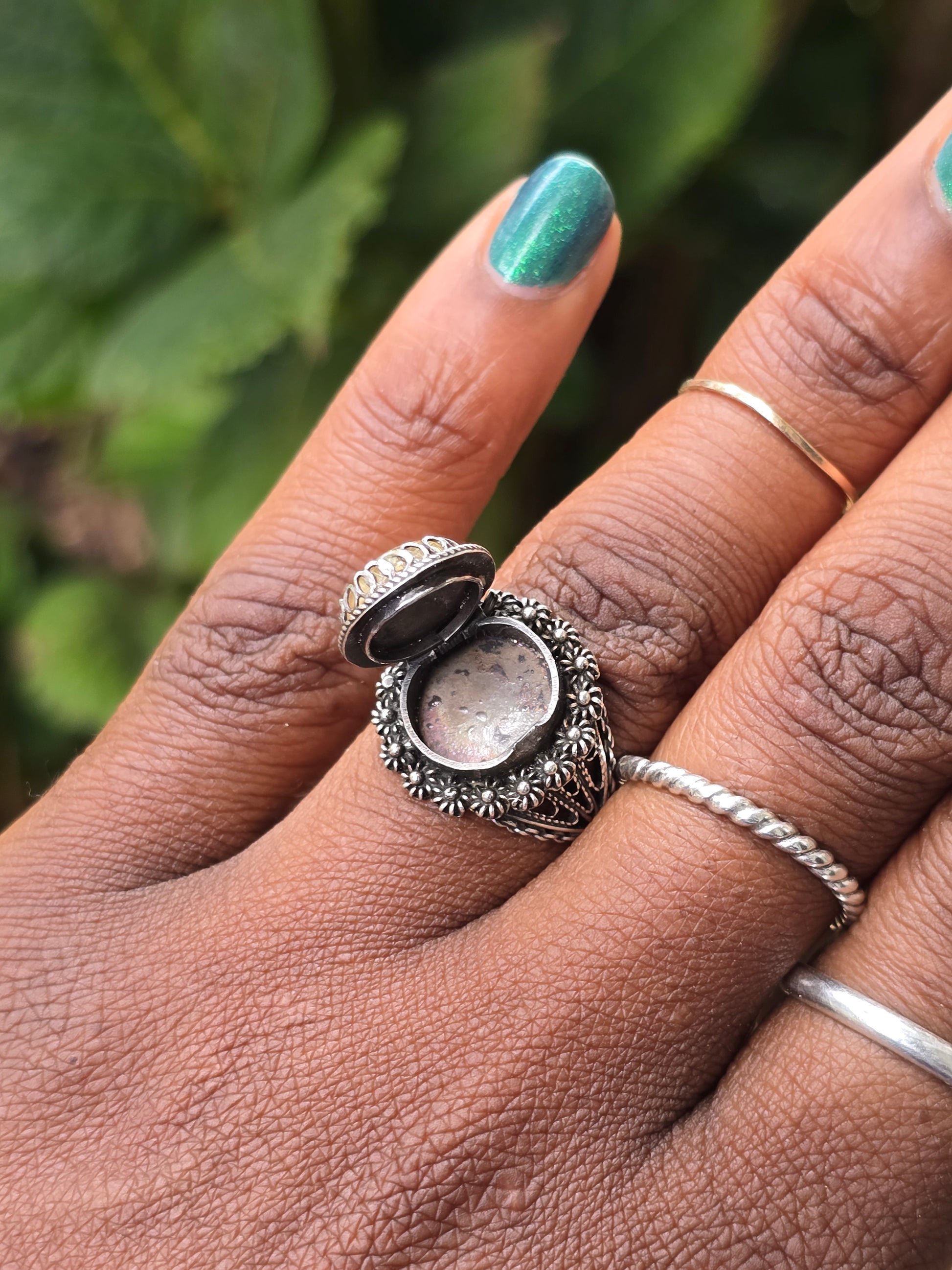 This Vintage Poison Ring has been lovingly restored to its former glory (and then some!) with Sterling Silver accents and a polished Golden Rutilated Quartz stone.